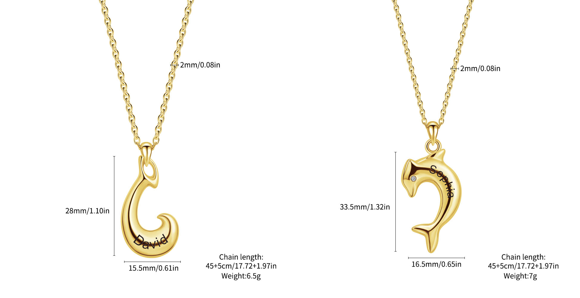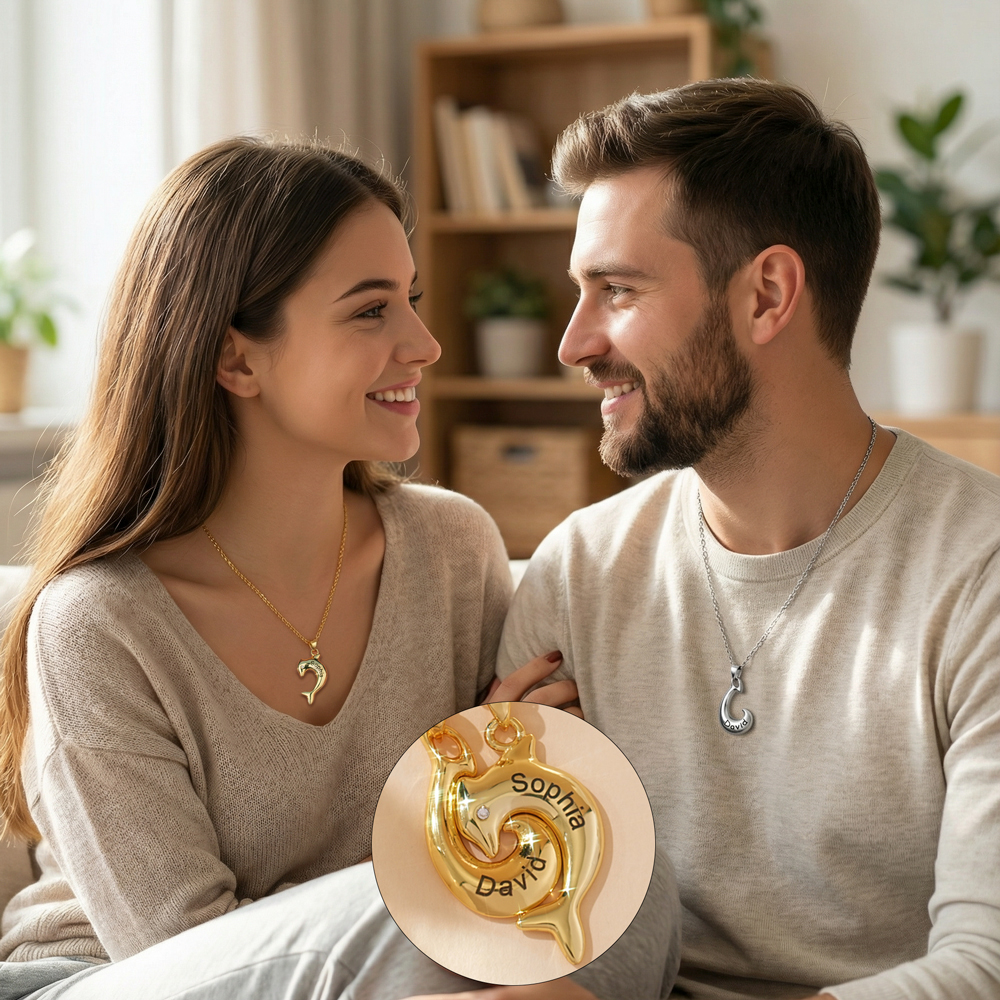 The hook pendant represents his promise to protect and pursue, while the fish-shaped pendant, flowing like a dolphin, symbolizes her beauty, freedom, and grace. Together, they form a meaningful love story — perfectly matched.